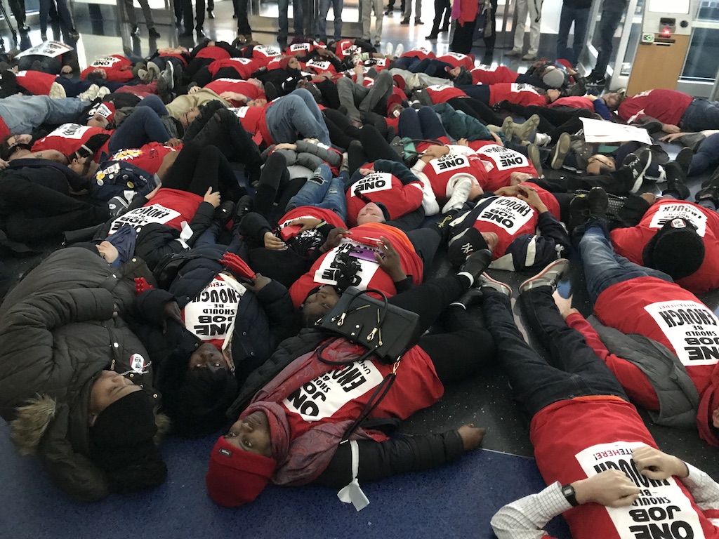 Earlier, a group of about 50 people staged a “die-in” inside the terminal, lying on the floor for about five minutes to dramatize that workers have inadequate or no health benefits. At a signal from a marshal, they got up and left before they were arrested.
