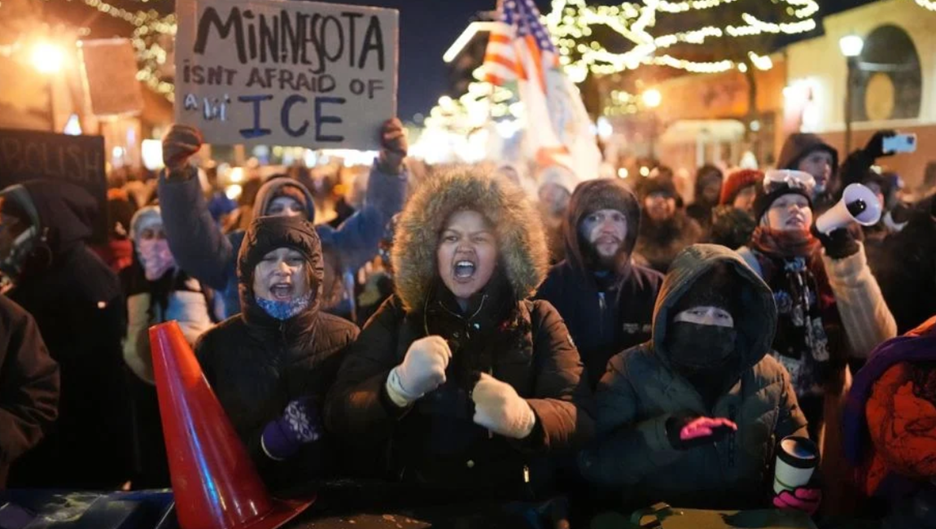 Above photo: Protesters chant and bang on trash cans as they stand behind a makeshift barricade during a protest in response to the death of 37-year-old Alex Pretti, who was fatally shot by a U.S. Border Patrol officer earlier in the day, Saturday, Jan. 24, 2026, in Minneapolis. Adam Gray / AP.