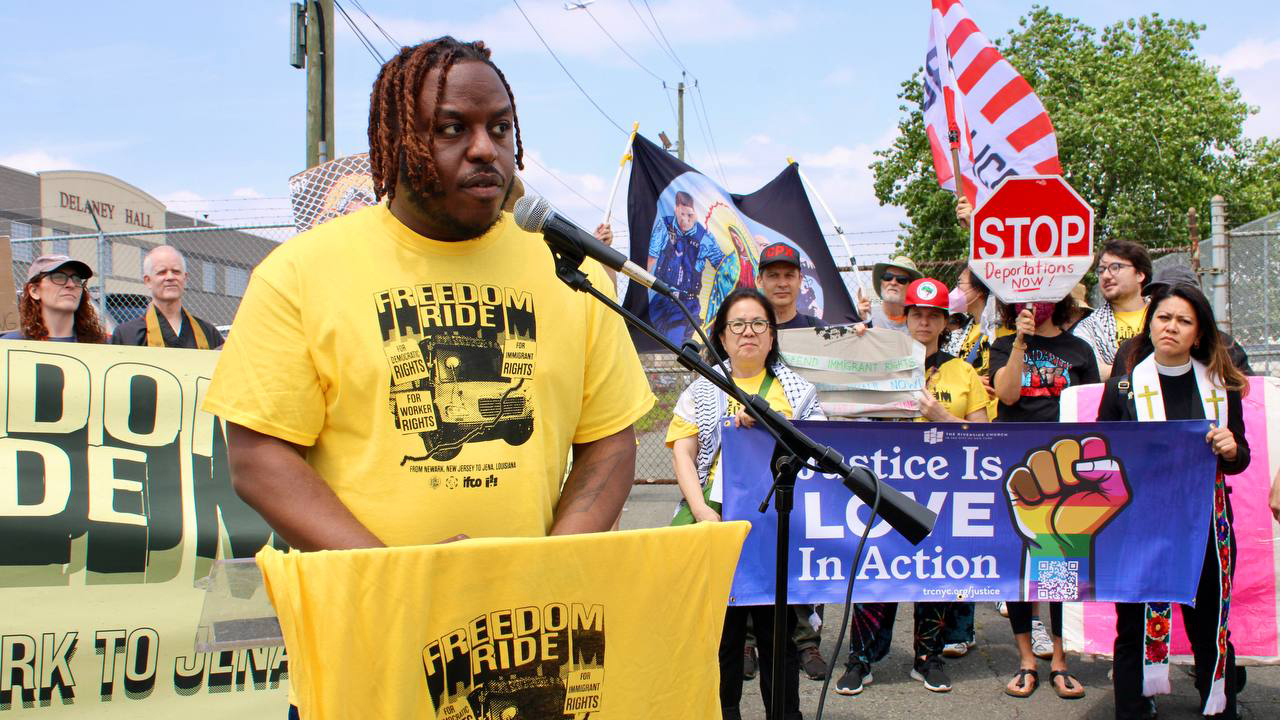In the next few days, the caravan convened by IFCO/Pastors for Peace, the Interfaith Center of New York, the People’s Forum, and the Riverside Church, will continue onto Atlanta, Georgia and Birmingham, Alabama, to finally end up in Jena, Louisiana – outside of the ICE detention facility where pro-Palestine activist and Columbia graduate Mahmoud Khalil has been detained for months.