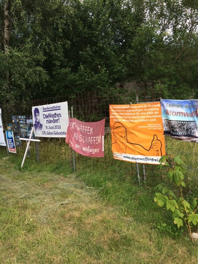 The organization behind the Peace Camp and the Peace Park is the Nonviolent Action Nuclear Weapons Abolition (Gewaltfreien Aktion Atomwaffen Abschaffen, GAAA). It has organized a remarkable twenty weeks of actions to represent the twenty nuclear bombs readied to kill millions. Vigils, rallies, prayer services, flyering, mass demonstrations and civil disobedience actions have been planned for the period that extends to August 9, 2018, Nagasaki Day. People and groups from throughout the continent check in and out. These peace warriors and prophets were greatly encouraged by the Nobel Peace Prize awarded to the International Campaign to Abolish Nuclear Weapons (ICAN). The leaders, including Marion Kuepker, say they are emboldened by the UN Nuclear Non-Proliferation Treaty. This coming weekend a half-dozen local churches, with a healthy mix of Catholics and Protestants, are expected to bring 500 parishioners to the main gate for religious services. Last year, a Catholic Mass brought 60 to the main gate.