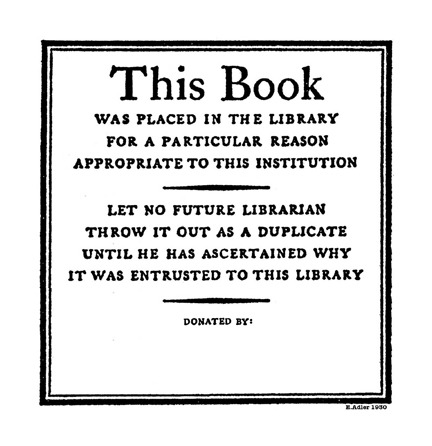 Donated books will be plated with this archival paper label designed by E. Adler in 1930. Applied to the inside cover, the plate will contain an inscription identifying the donor and the person(s) being honored or memorialized.