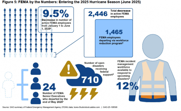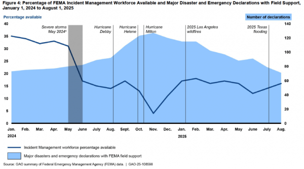 Workforce reductions and loss of training capacity have severely compromised FEMA’s reliability as a partner in disaster response, GAO researchers write. FEMA’s slow mobilization to the July Hill Country floods that claimed more than 130 lives in a few days is well documented. But the GAO makes another fact clear: When the rain began to fall over Kerr County, only 15 percent of FEMA’s incident management workforce were available. That number was a mere 12 percent at the start of the year’s hurricane season, according to the GAO. It’s bad news as the country today moves through peak hurricane season.