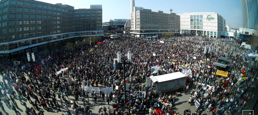 Above Photo: A general view shows people taking part in a protest against rising rents and a housing shortage in Berlin, Germany April 6, 2019. Picture taken with a fish eye lens. REUTERS/Fabrizio Bensch