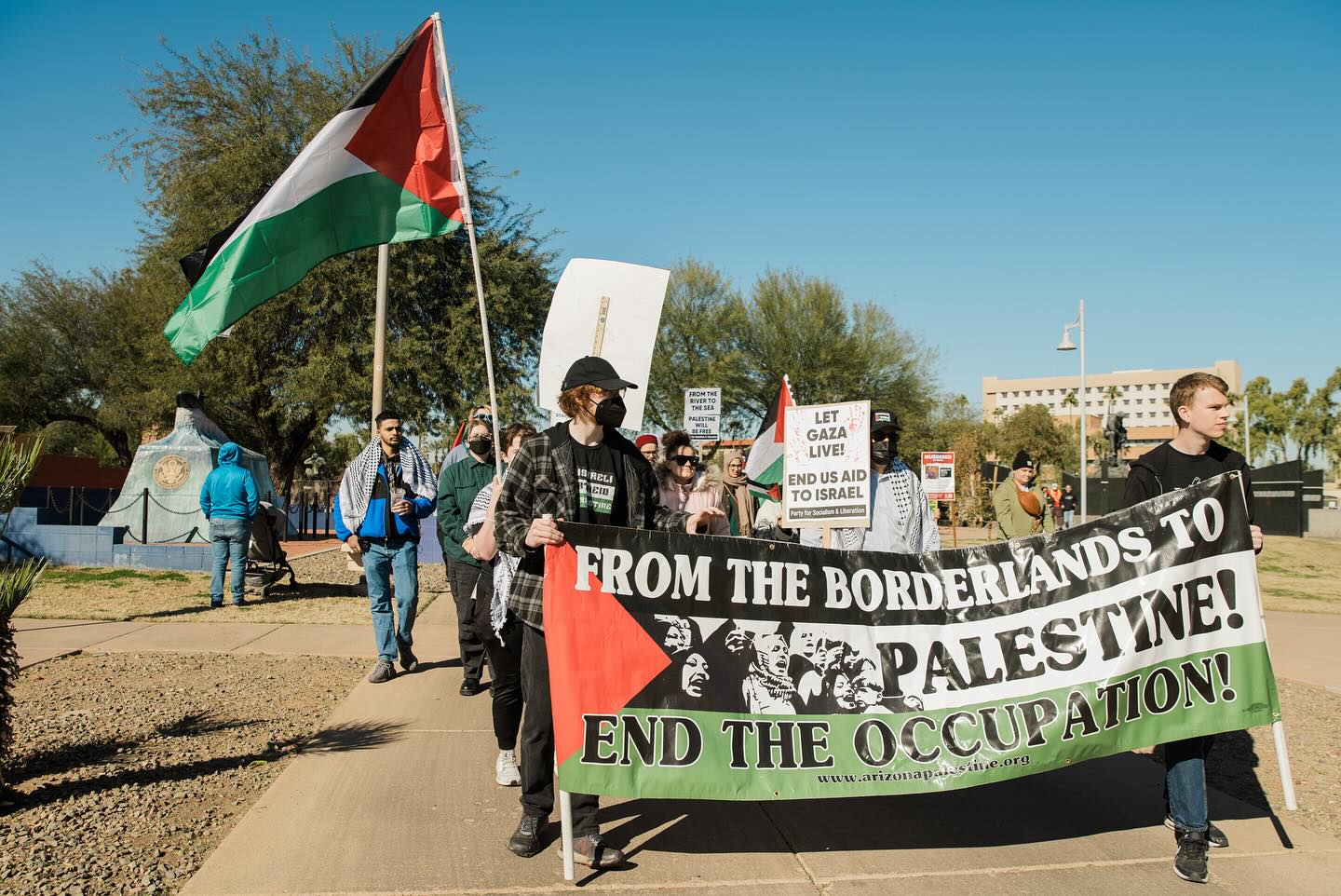 Above photo: Students for Justice in Palestine – Arizona State University march to the Arizona state capitol on January 13, 2024, in to demand a ceasefire in Gaza and an end to U.S. support for Israel. Caitlin O’Hara and Juntos Photo / Arizona State SJP Facebook.