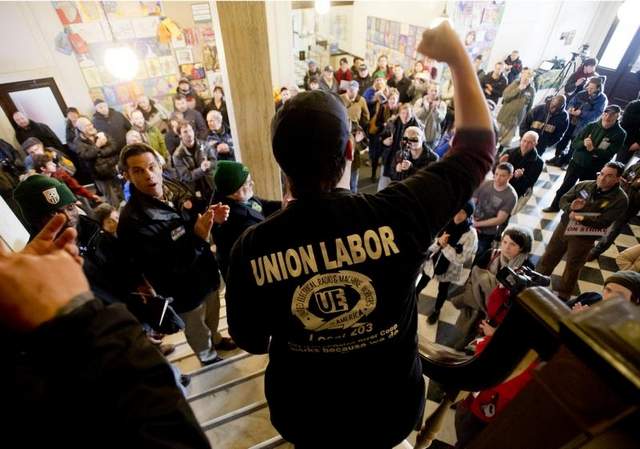Supporters of striking drivers with the Chittenden County Transportation Authority took to the stairwell outside the Contois Auditorium at Burlington’s City Hall, chanting, “Get up, get down, Burlington’s a union town,” while the council was in executive session over the first item on the agenda at its special meeting Wednesday.