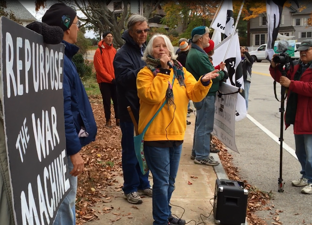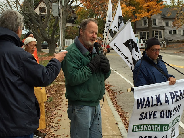 I was delighted to have a day to join the Maine Peace Walk: Militarization of the Seas on Saturday October 24, 2015. A high energy opening circle kicked off the final day of the walk which began two weeks prior in Ellsworth, Maine. Jun-san’s joyful dancing and her leadership along with other members of the Nipponzan order of Buddhists was much appreciated. And everyone enjoyed the tunes offered by the Leftist Marching Band.