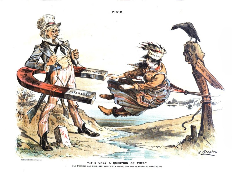 Above photo: An 1891 editorial cartoon from New York’s Puck magazine shows a young Canada being pulled inexorably toward Uncle Sam by the joint forces of business and common interests. The caption reads: “It’s only a question of time.” Illustration by Joseph Keppler.
