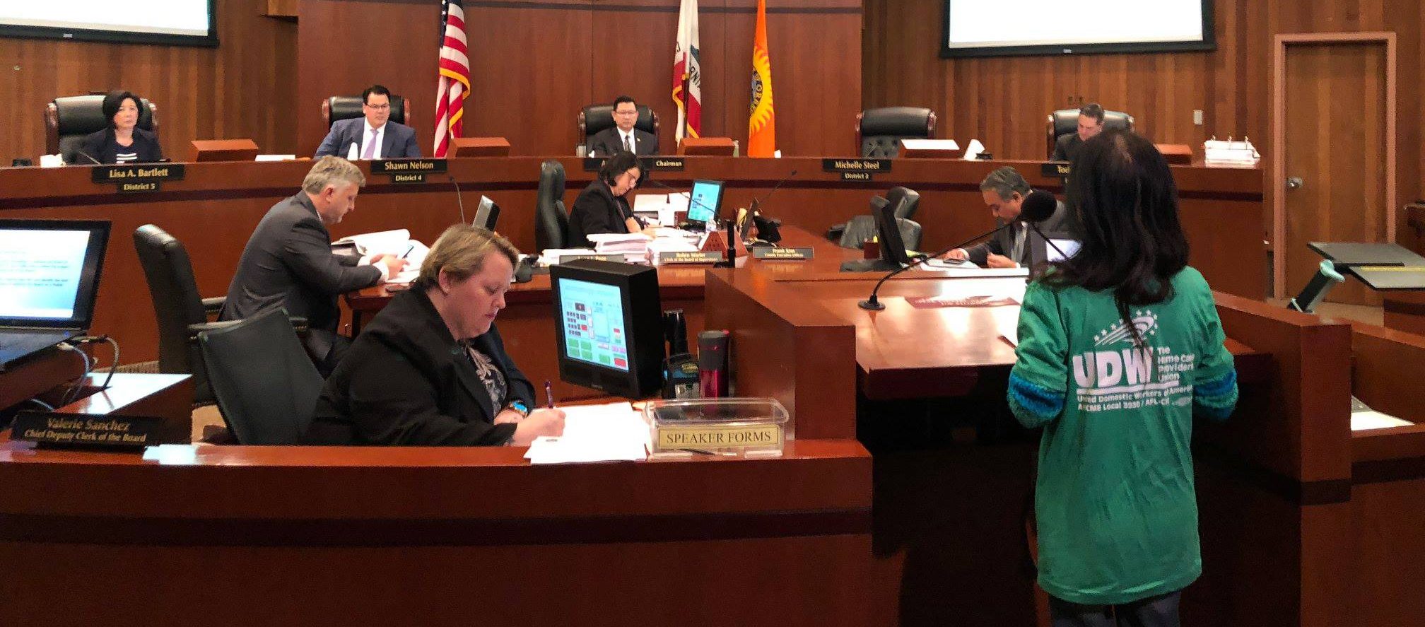 Above Photo: A union home care worker addresses the Orange County Board of Supervisors.