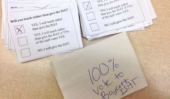 The unanimous “Yes” vote was taken on a paper ballot (see above) that asked the question: “Will You Teach Rather Than Give the ISAT?”