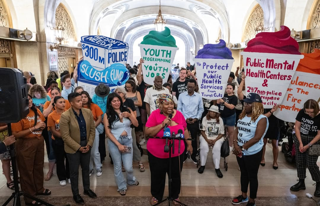While the vote on the snap curfew united the forces who mobilized Wednesday, there was a broader convergence of progressive causes. Immigrant rights forces showed up to demand the release of the bodycam footage from a recent instance where Chicago police officers were seen collaborating with ICE. Groups representing senior citizens showed up to demand the passage of a Senior Bill of Rights. A coalition of groups pushing for funds budgeted for vacant sworn CPD officer positions to be reallocated to fund public health, youth jobs, mental health emergency response, and the fire department held a press conference in the lobby kicking off their campaign.