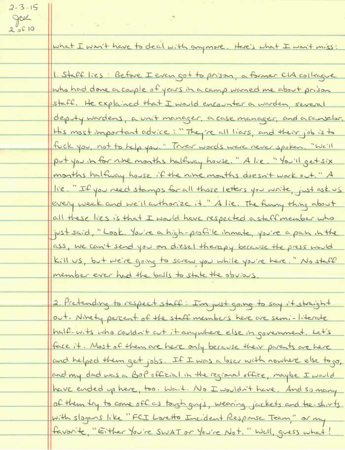 1. Staff lies: Before I even got to prison, a former CIA colleague who had done a couple of years in a camp warned me about prison staff. He explained that I would encounter a warden, several deputy wardens, a unit manager, a case manager and a counselor. His most important advice: “They’re all liars, and their job is to fuck you, not to help you.” Truer words were never spoken. “We’ll put you in for nine months halfway house.” A lie. “You’ll get six months halfway house if the nine months doesn’t work out.” A lie. “If you need stamps for all those letters you write, just ask us every week and we’ll authorize it.” A lie. The funny thing about all these lies is that I would have respected a staff member who just said, “Look. You’re a high-profile inmate, you’re a pain in the ass, we can’t send you on diesel therapy because the press would kill us, but we’re going to screw you while you’re here.” No staff member ever had the balls to state the obvious.