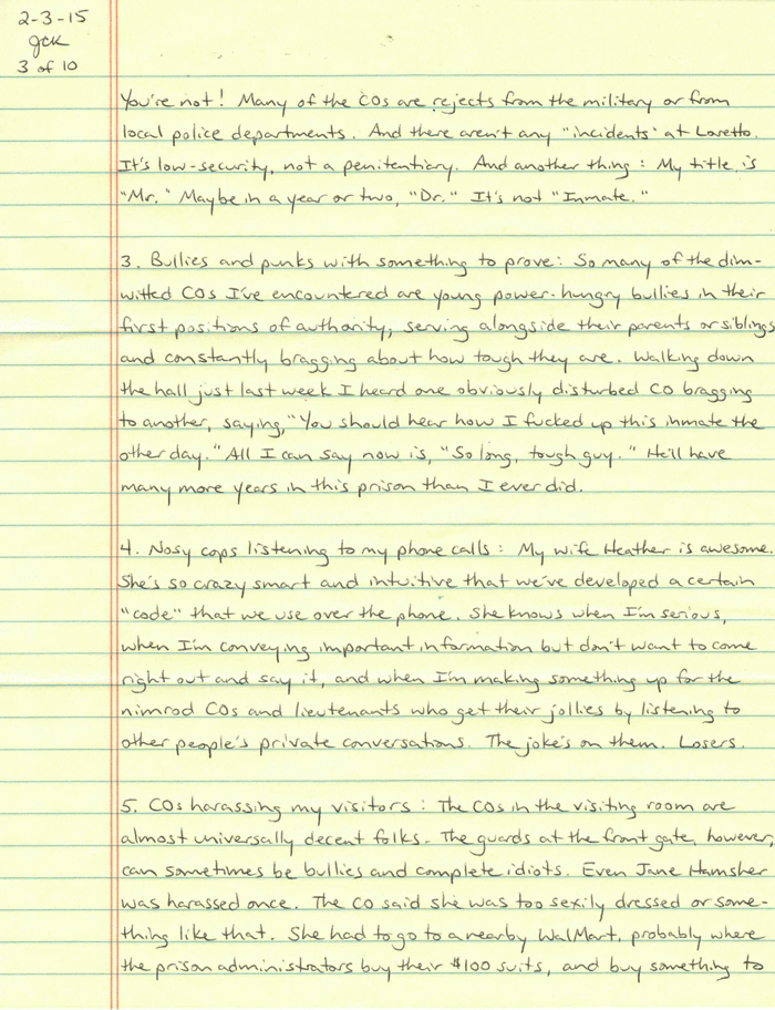 Then, Kiriakou launches into 19 different things he will not miss: “staff lies,” “pretending to respect staff,” “bullies and punks with something to prove,” “nosy cops listening to my phone calls,” correctional officers (COs) “harassing my visitors,” staff acting like they’re doing him favors when they actually do their jobs, “waiting for four days to send or receive an email from my family or attorneys,” waiting days to receive mail, only to have it tampered with, “ten-minute moves” and locked doors during “ten-minute moves,” commissary, begging the staff for permission to buy stamps, medical, the cafeteria, standing in line, “involuntary servitude,” not being able to change the TV channel “because I’m white,” “count time” and pedophiles.