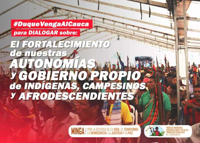 There is a crisis happening right now in Cauca, Colombia. The Colombian Armed Forces have attacked a “minga” in the village of Cairo, municipality of Cajibío – twice in two days – and are still present and threatening more assaults. The minga is a collective consultation called by indigenous, Afro-Colombian, and farming communities and organizations, including FENSUAGRO, the agricultural workers union and with whom the Alliance for Global Justice works. Participants are demanding to meet with Colombia’s President Ivan Duque, who has so far not responded. The minga has been called to advocate for land rights and an end to political violence and displacement. The minga is happening throughout Cauca, with tense encounters also occurring in other townships.