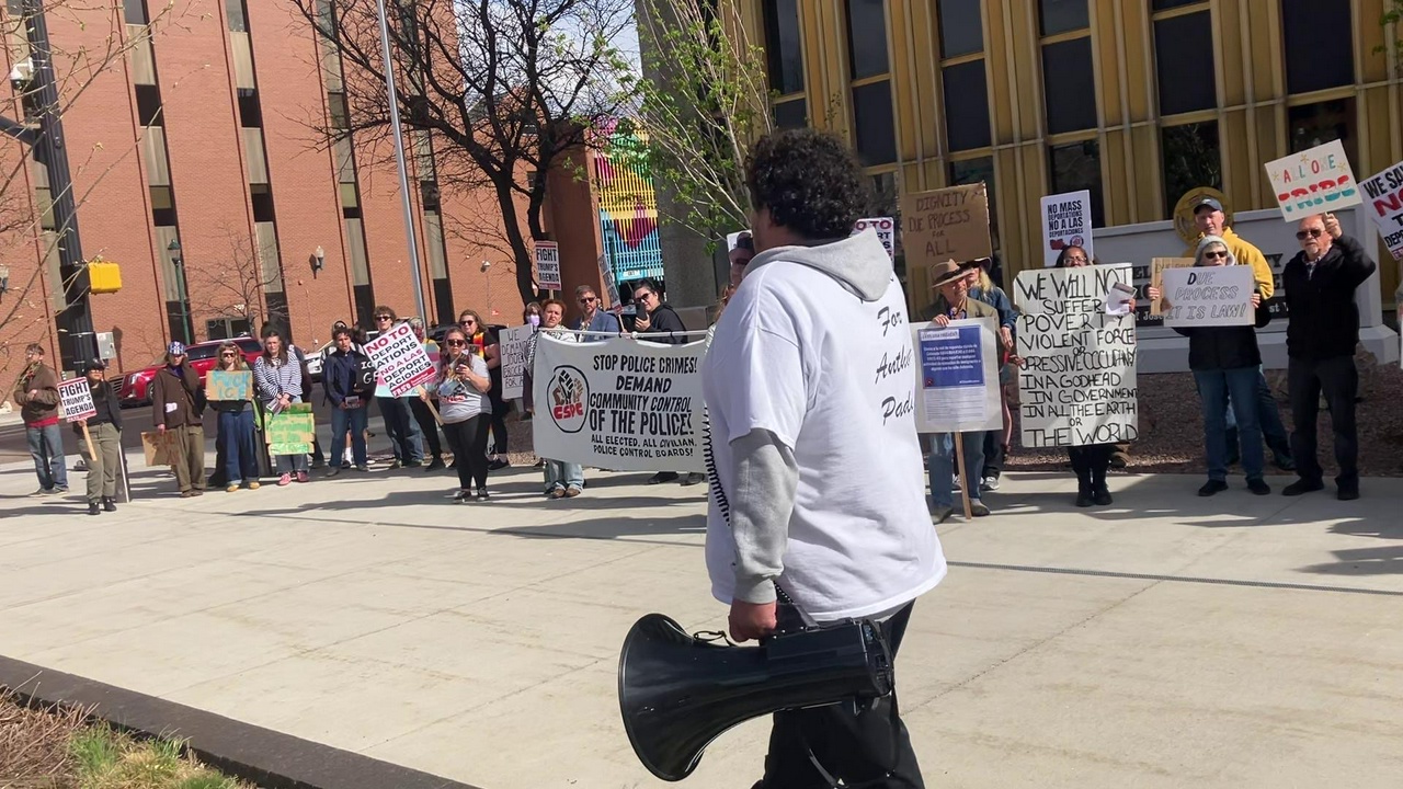 Yoselin Corrales of Aurora Unidos recalled false narratives about “violent gangs taking over Aurora” in 2024. CSPC founder Brandon Rincon called the raids “terror attacks targeting Black and brown people.” Rincon called for community control of the police as a solution to make the community safer, stating, “These are police crimes, and how do we stop police crimes? Well, we stop police crimes with community control — an all-elected, all-civilian board that has the power to write policy, hire and fire police officers, investigate misconduct and harassment, and get these officers off the force.”