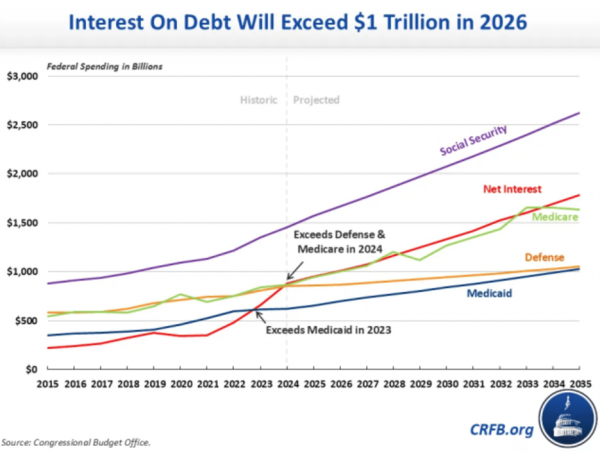 Interest is now the fastest growing line item in the entire federal budget. The government paid $970 billion in net interest in FY2025, more than the Pentagon budget and rapidly closing in on Social Security. It already exceeds spending on Medicare and national defense and is second only to Social Security. The Congressional Budget Office projects that interest will reach nearly $1.8 trillion by 2035 and will cost taxpayers $13.8 trillion over the next decade. That is roughly what Social Security will pay out over the same decade (about $1.6 trillion a year). The Social Security Trust Fund is running dry, not because there are too many seniors, but because interest payments are consuming the federal budget that should be shoring it up.