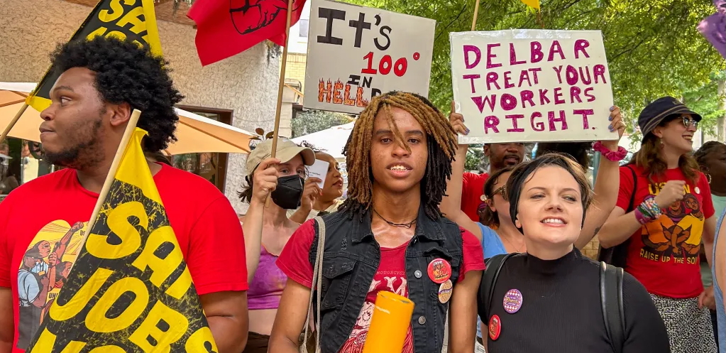 Above photo: Cooks and servers with the Union of Southern Service Workers walked off their job at an Atlanta restaurant in July 2024, demanding $25 an hour and air conditioning. USSW.