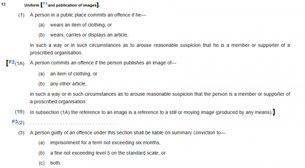 Here is the relevant part of Section 13 of the Terrorism Act.