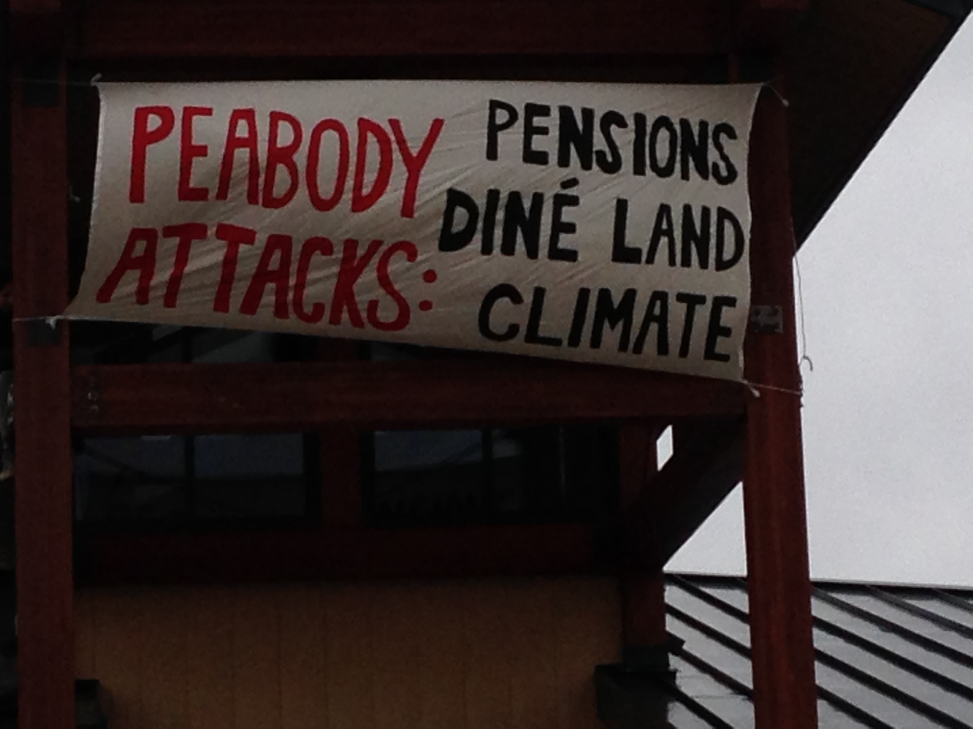 Of all the people I met, and all the issues being confronted, there was one issue that touched me more deeply than all the rest. Early in my journey, I took a detour to St. Louis to join some of my Veterans for Peace friends (who had provided security at Freedom Plaza) in protesting Peabody Coal’s devastating mining practices. I was filming the rally in front of the corporate headquarters when Don Yellowman, Dineh from Navajo Nation in Arizona, began speaking. He was talking about genocide, the broken treaties, the children with asthma, the preponderance of kidney disease, diabetes and cancer, the formerly pristine springs now infested with arsenic and other heavy metals, the elders without electricity or potable water. He talked about the part played by Peabody Coal, the U.S. government, the tribal government, the BIA and BLM in all of this.