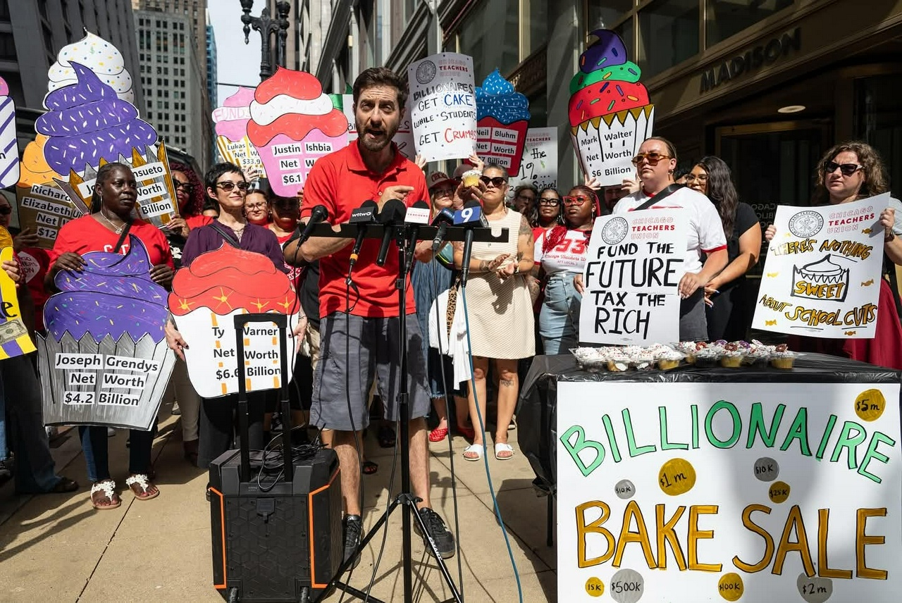 “The top 5% of top earners in Illinois got $7.7 billion in tax cuts from the Big Horrible Bill,” Jackson Potter, the CTU vice president, explaining that these tax cuts are happening while public education, healthcare and transportation each face hundreds of millions of dollars in budget cuts.