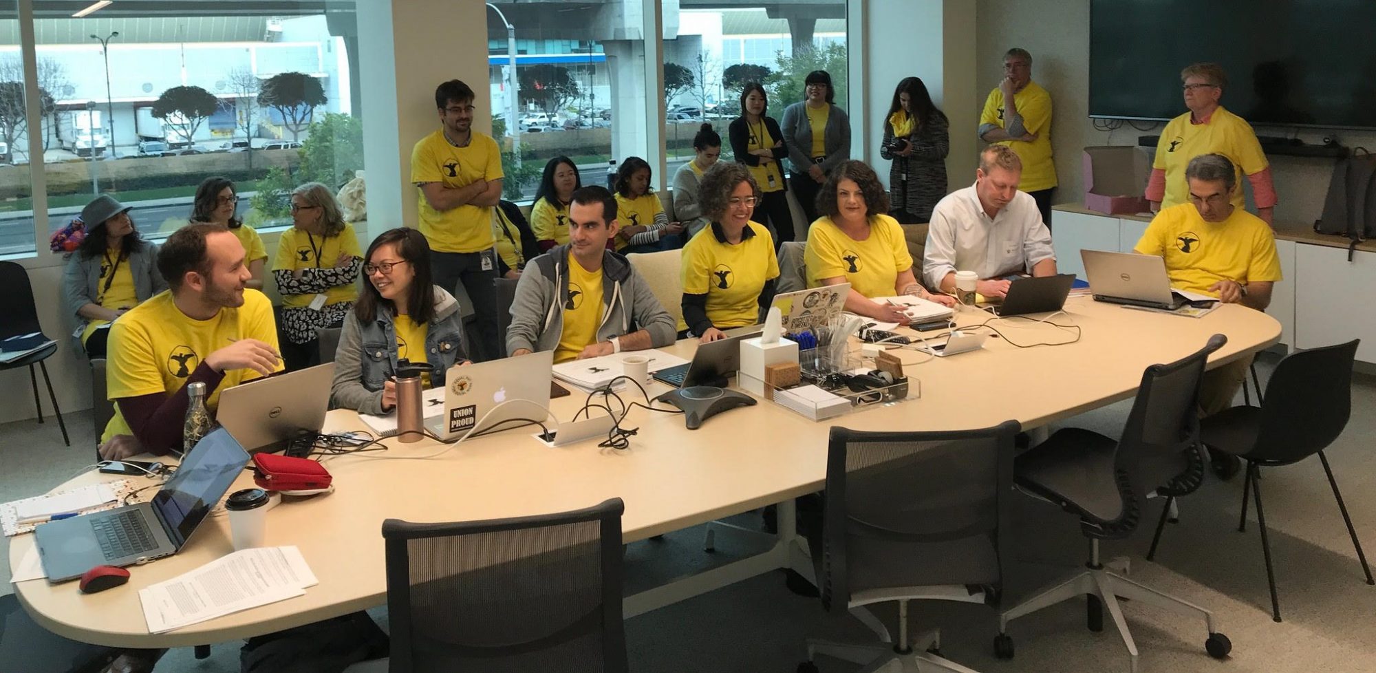 Above Photo: The LA Times bargaining committee, part of the NewsGuild-CWA union, at the negotiating table. Jay L. Clendenin.