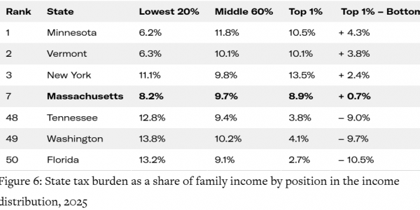 Fair Share has been a fiscal success in Massachusetts, but the future of using state income taxes to reform our way into social-democratic paradise is still unclear. For one, revenue generated is small compared to sales taxes. It will not offset $1 trillion in federal tax cuts to the wealthiest Americans. Massachusetts’ 9% top marginal rate is lower than New Jersey’s (10.75%), New York’s (10.90%), and California’s (13.30%). The state tax burden, like most states, is still regressive: the middle 60% of families on the income distribution pay about 9.7% of their annual budget in state taxes while the richest 1% pay 8.9%. This happens because the rich can afford to save their incomes while those lower down have to spend a higher portion of their budgets in the real economy, catching consumption taxes in the process.