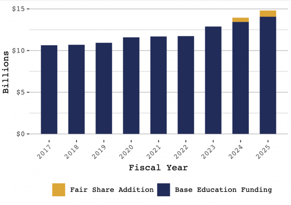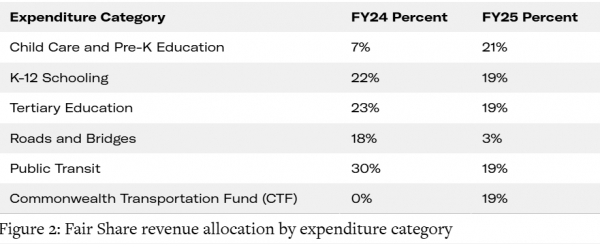 Since 2022, Massachusetts generated $5.7 billion from the tax — $2.46 billion the first full fiscal year and $2.99 billion the second — doubling initial forecasts.[2] For FY2025, Fair Share revenue made up about 5% of the total state budget. Revenue has been spent on education and transport infrastructure, as required by the amendment. Early evidence is that Massachusetts is using the funds to supplement, not offset its education spending:
