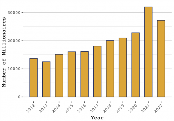After two and a half budget cycles, Fair Share revenue attests to the fact that Bay State millionaires are staying and paying. IRS tax returns reveal the number of filers reporting adjusted gross incomes above $1 million has generally climbed, although as of writing the IRS hasn’t released individual filing data from 2023: