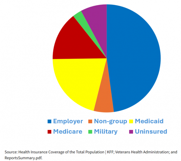 It’s helpful to think of the U.S. health care system like a pie made up of different slices (Figure). The largest (blue) slice is employer health insurance, which covers 160 million workers and their dependents; individual non-group insurance (in orange) provides 24 million individuals and their families with patchy insurance (including the enhanced subsidies); Medicaid (in yellow) covers 65 million poor and low-income adults, children, and seniors; Medicare (in red) pays for medical care for 60 million seniors and people with disabilities; the Veteran’s Health Administration (in bright green) provides the best socialized medicine in the nation to 9.1 million qualifying veterans; and that leaves the rest, approximately 28 million Americans, in the (purple) slice of the uninsured. It’s a patchwork arrangement that keeps Americans sliding from one slice to another their entire life until they turn 65, when they finally land on Medicare.