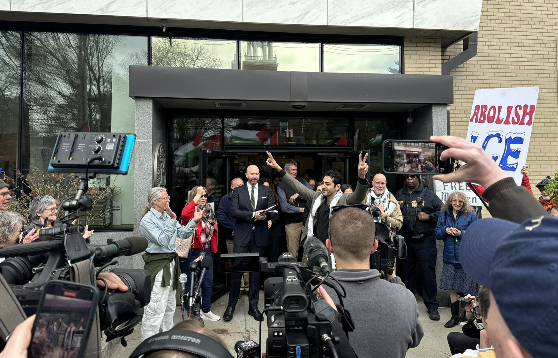 Above photo: Mohsen Mahdawi addressing the press and supporters outside a Vermont courthouse following his release, on April 30, 2025. Photo posted to social media by Liz Crampton/Politico.
