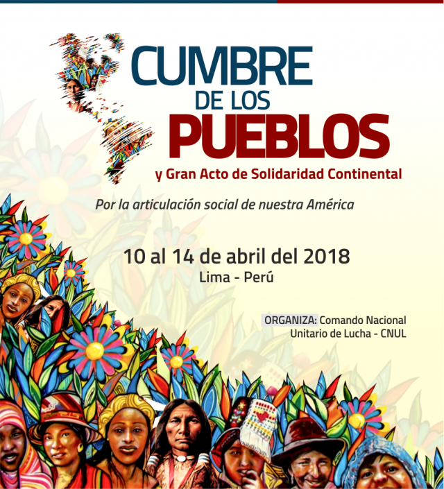 We, the representatives of social and popular organizations of Peru, Latin America and the Caribbean, have met in Lima / Peru from April 10 to 14, 2018 to discuss the political, social and economic reality of our America, to share our struggles and resistance, to strengthen the militant solidarity of our peoples and the continental unity of the social and popular movements of our region.