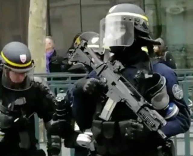Police stationed at the Arc de Triomphe for Yellow Vest protests last Saturday carrying semi-automatic rifles with live ammunition