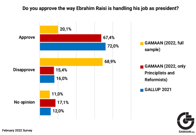 For instance, in a 2022 survey on Iranians’ political beliefs, GAMAAN reported far lower approval ratings for then-president Ebrahim Raisi compared to those reported by Gallup in a 2021 survey. GAMAAN itself highlighted this divergence (illustrated in the graphic below), but wrote that “both surveys are substantially similar … if Gallup’s results are compared with only the Principlists and Reformists in GAMAAN’s sample” (meaning, responses from more conservative and incrementalist participants in GAMAAN’s survey align with Gallup’s findings across its entire sample).