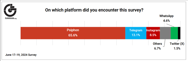 But according to polling experts, GAMAAN’s findings cannot be generalized to the broader Iranian public due to significant bias in who its surveys reach. GAMAAN relies chiefly on the Psiphon VPN platform to circulate its survey questionnaires, with about 66% of respondents in its latest poll participating through the platform, and the remainder reached through Telegram (13.1%), Instagram (8.5%), WhatsApp (4.6%), X (1.5%), and the remaining 6.7% through other undisclosed channels.
