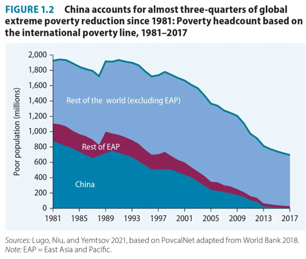 China lifted nearly 800 million people out of extreme poverty. And according to the World Bank, China is responsible for three-quarters of global reduction in extreme poverty.
