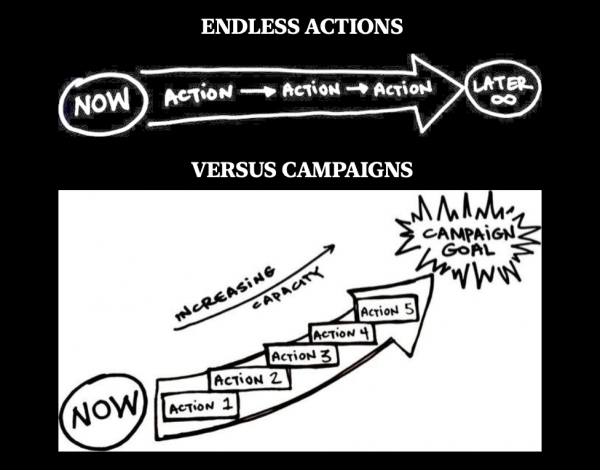 Jonathan Matthew Smucker in his book, Hegemony How-To: A Roadmap for Radicals, describes the pitfalls of utilizing prefigurative politics, especially a watered down version of it, as the sole mechanism for power building writing, “The prefigurative politics model likewise starts with the layer of vision (also atop a material base), but it skips over—and glosses over—the layer of political strategy.” He adds, “Instead it plans actions to directly manifest the essence of its vision. As such, its actions are not tactics—insofar as tactics are steps to move forward a strategy—but are rather direct expressions or prefigurations of the actor’s vision. Means and ends are one and the same in this model.” And in his book, Building a Movement to End the New Jim Crow, Daniel Hunter compounds Smucker’s assertion by naming the need to learn the art of effective campaigning rather than getting stuck in stasis of endless actions, “However, unless we can direct our energy from reactive to proactive, we will be stuck on the defensive. Instead of adapting to the timeline of the courts, the board of pardon and paroles, or the police department’s internal investigations, we need to create our own timeline that allows us to keep building pressure and power.”