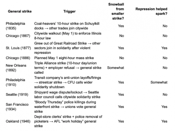 The need for strong momentum cuts against the suggestion of some seasoned US labor organizers that you can bring about a general strike simply by scaling up traditional strike preparation tactics like having one-on-one conversations with all your co-workers and launching escalating super-majority “structure tests” to measure support. Almost every general strike in US history has been sparked by a much smaller labor struggle whose dynamism, popularity, and confrontations with authorities generate enough momentum for large numbers of other workers to suddenly jump in to show solidarity (see table below).