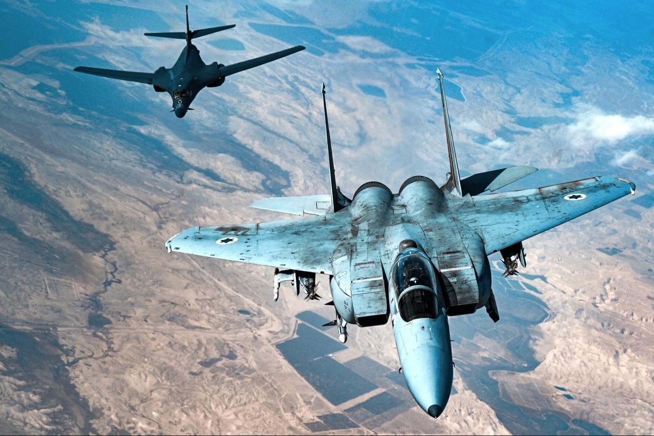 Above photo: An Israeli Air Force F-15 Strike Eagle flies in formation with a U.S. Air Force B-1B Lancer over Israel as part of a deterrence flight Saturday, October 30, 2021. U.S. Air Force/Senior Airman Jerreht Harris.