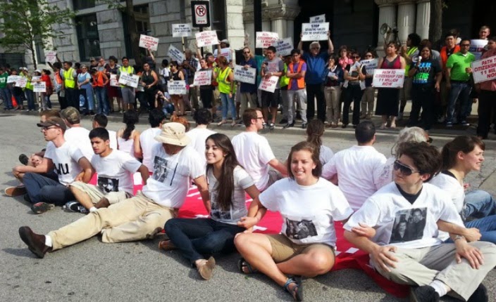 Above photo: By VDLF, More than one hundred supporters and family members of immigrants stage rally and sit-in in front of Republican U.S. Senator Ron Johnson’s Milwaukee office.