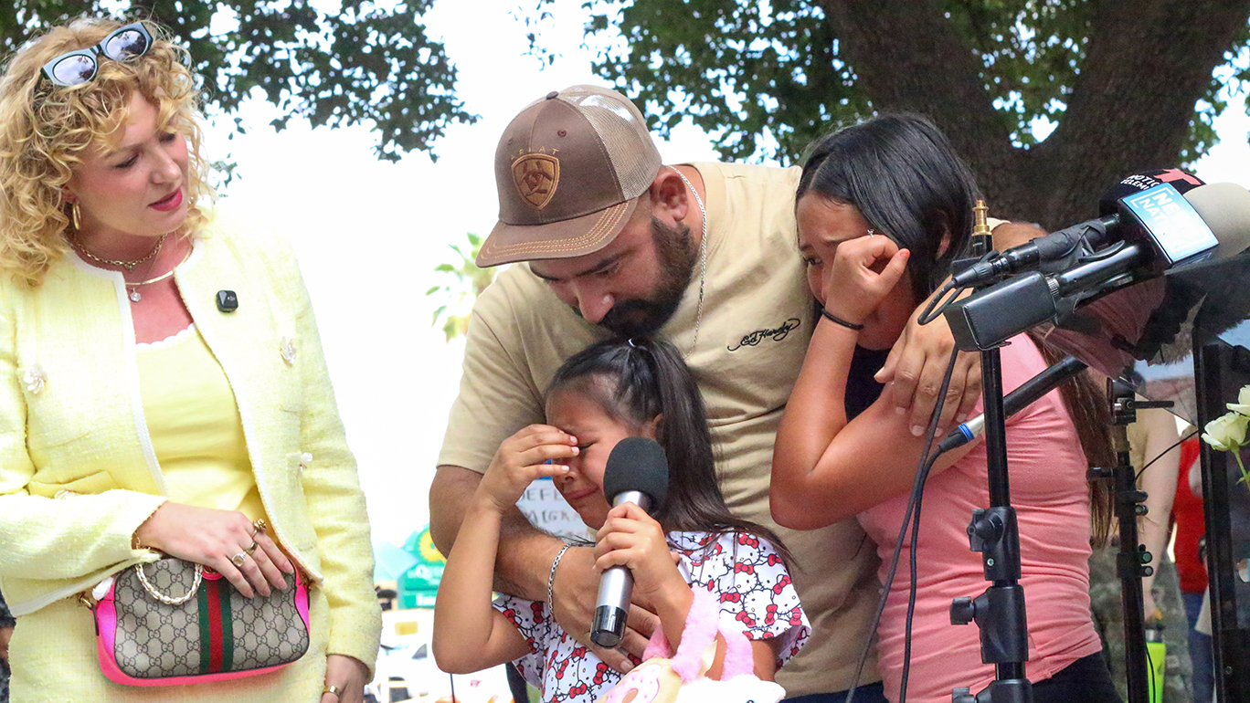 170 immigrant rights activists gathered on June 3 for a press conference outside of San Antonio Immigration Court. Kate Lincoln-Goldfinch, an immigration attorney in Texas, stepped up to the podium, alongside a family of three – Eduardo and his daughters Olivia and Jocelyn. Carmen, Eduardo’s wife and the mother to five daughters who are US citizens, was arrested by ICE along with others outside a San Antonio Immigration Courthouse last week.