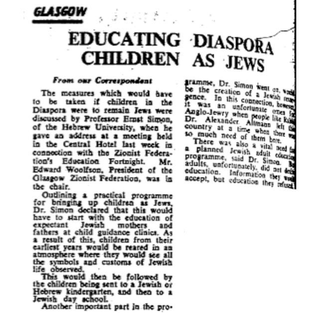 The measures which would have to be taken if children in the Diaspora were to remain Jews were discussed by Professor Ernst Simon, of the Hebrew University, when he gave an address at a meeting held in the Central Hotel last week in connection with the Zionist Federation’s Education Fortnight. Mr. Edward Woolfson, President of the Glasgow Zionist Federation, was in the chair. Outlining a practical programme for bringing up children as Jews, Dr. Simon declared that this would have to start with the education of expectant Jewish mothers and fathers at child guidance clinics. As a result, children from their earliest years would be reared in an atmosphere where they would see all the symbols and customs of Jewish life observed. This would then be followed by the children being sent to a Jewish or Hebrew Kindergarten, and then to a Jewish day school. Another important part in the programme, Dr. Simon went on, would be the creation of a Jewish resurgence…