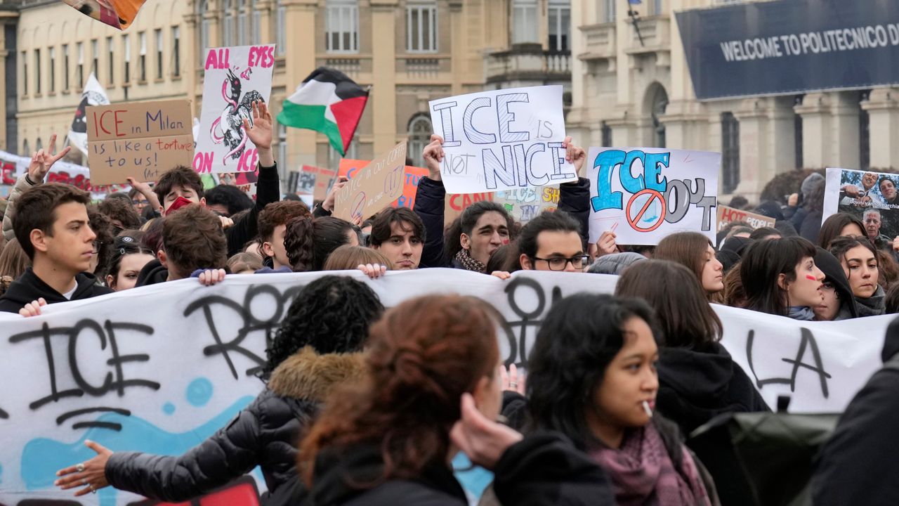 Above photo: Protesters walk with signs during a demonstration against ICE organized by students at the 2026 Winter Olympics, in Milan, Italy, Friday, Feb. 6, 2026. AP Photo/Luca Bruno.