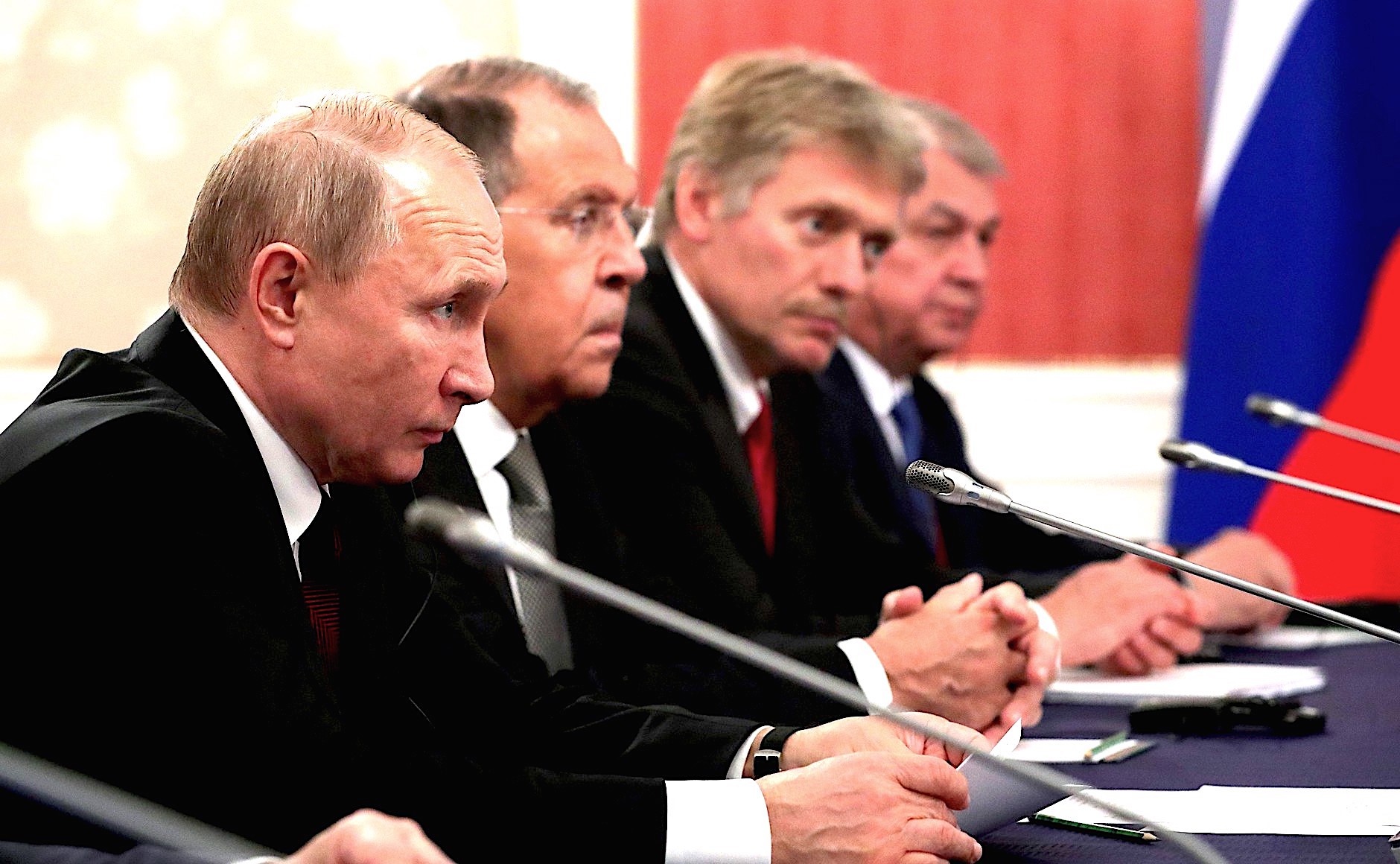 Above photo: Russia’s President Vladimir Putin, Foreign Minister Sergei Lavrov and Kremlin Spokesman Dmitry Peskov. 2019. Kremlin.ru, Wikimedia.