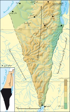 A map will show that the Naqab makes up almost half of Palestine’s entire land mass. It is shaped like a triangle with its apex in the south towards the Bay of Aqaba, in what used to be called Um Al-Rashrash and is now the Israeli town of Eilat. The Naqab borders the Sinai Peninsula on the west and the Jordan River Valley on the east. On its northern boundary lays the Wilderness of Jerusalem, or Barriyat Al-Quds.