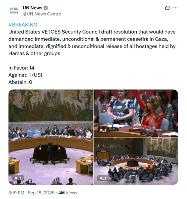 The conflict in Gaza has been dragging on for nearly two years, causing an unprecedented humanitarian catastrophe. Time and again, the Security Council has attempted to take actions, only to be forcefully blocked by the United States.