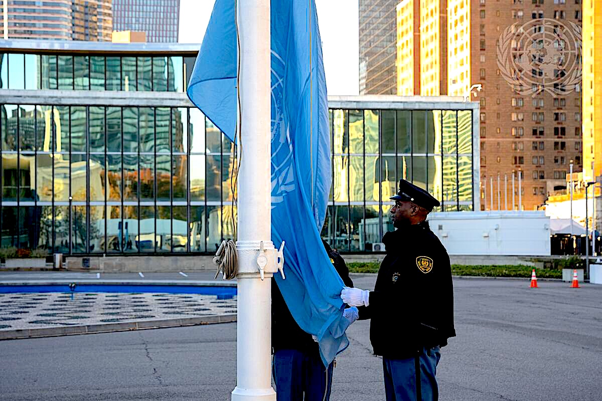 Above photo: The United Nations flag lowered to half-mast at New York headquarters to honor colleagues killed in Gaza, Nov. 13, 2023. UN Photo/Evan Schneider.