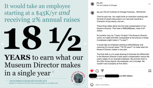 Graphic from the Instagram page of Art Institute of Chicago Workers United highlighting pay inequity in the museum.