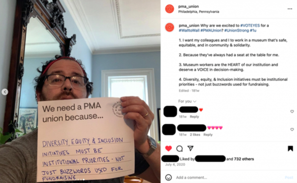 Unionization campaigns demand access – and corrections – to the financial calculations that result in low wages and extreme pay gaps. It is no coincidence that much of the contemporary organizing wave occurred after the grassroots Art + Museum Salary Transparency campaign went viral in 2019. Museum workers anonymously shared salary information in an online spreadsheet. The revelations around pay discrepancies and injustices directly influenced organizing at the Philadelphia Museum of Art and, in turn, helped inspire other museum workers across the country to unionize. Access to more information serves as a powerful organizing motivator. As one interview participant implored, “Make it make sense to me. Sit me down and really walk me through the numbers if you want to make other concessions elsewhere that lead to me not being paid more for my labor.”