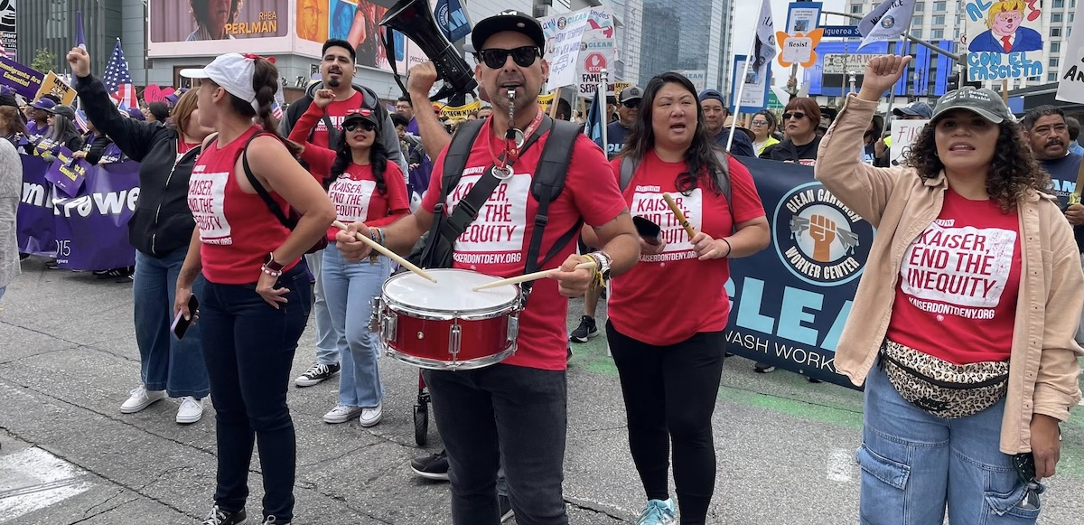 Above photo: Kaiser strikers march in the May Day parade in Los Angeles. They struck for six-and-a-half months, ending May 5. NUHW.