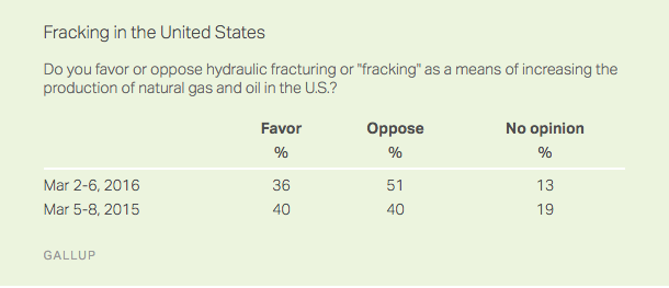 In Gallup’s 2016 Environment survey, conducted March 2-6, Americans have a clearer position on fracking than they did a year ago. Last year, 40% said they favored fracking and 40% were opposed, with a substantial 19% not knowing about or having no opinion on fracking. In 2016, support for fracking has slipped to 36%, while opposition has climbed to 51%. The percentage of Americans with no opinion has dropped to 13%, perhaps as the term becomes more commonplace in the culture, or as the media has more extensively covered the arguments for and against fracking.