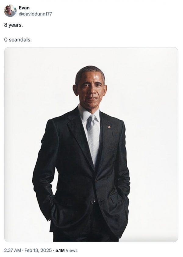Now that Trump is back in office I’m again seeing Democrats posting fondly about Barack Obama and how wonderful it was to have a president whose worst scandal was wearing a brown suit once. During the first Trump administration such sentiments were a great way to go viral on Liberal Twitter.
